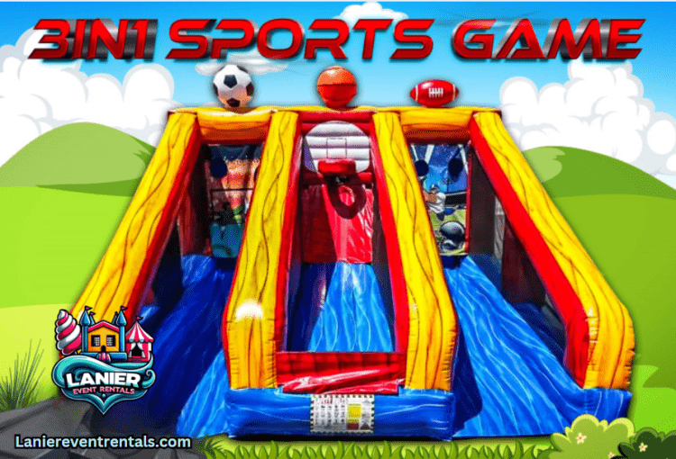 The All-New Triple Threat Sports Game Features Soccer, Basketball and Football and has all the new vibrant colors.  It is sure to be a hit of any school, church, corporate event or backyard party!