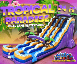 Turn any party into a tropical getaway with our brand-new 24-foot Dual Lane Tropical Paradise Waterslide! This towering inflatable is packed with non-stop thrills, vibrant palm tree vibes, and two racing lanes for double the fun.